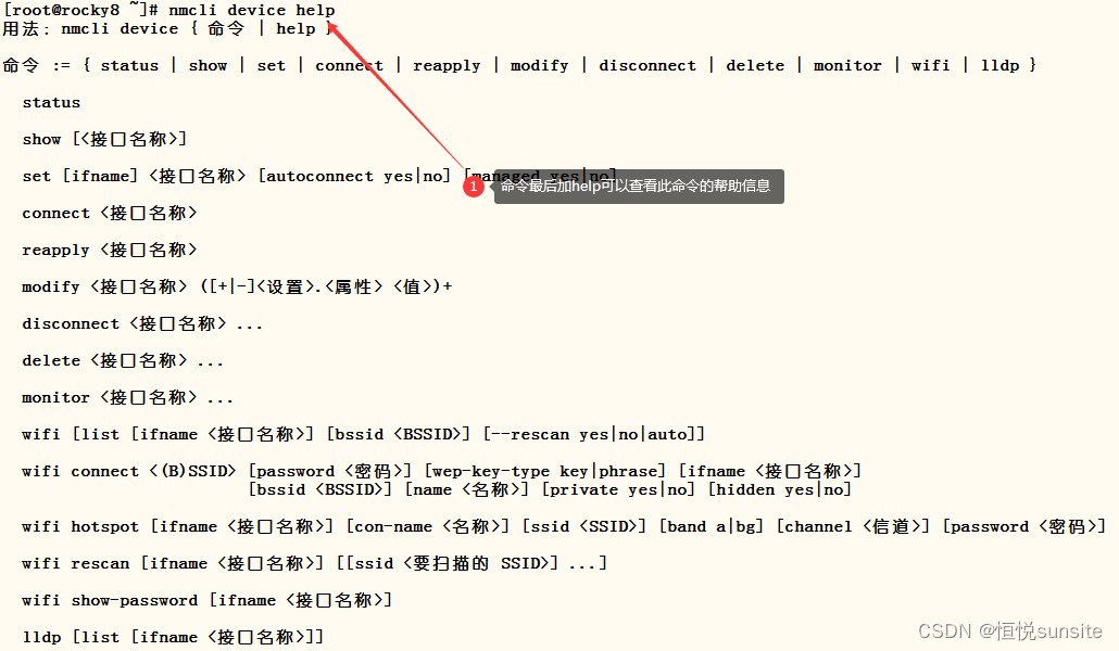 nmcli命令非常友好,命令及子命令状态下都可以加上help获取命令的帮助信息。