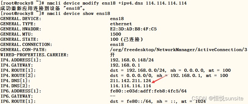 [root@rocky8 ~]# nmcli device modify ens18 +ipv4.dns 114.114.114.114