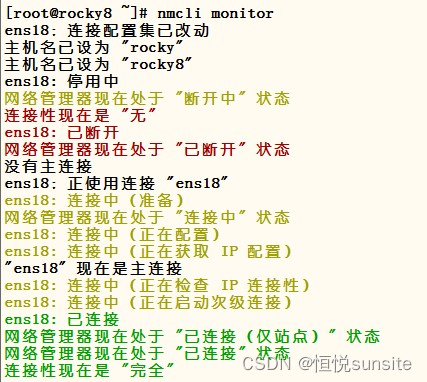 [root@rocky8 ~]# nmcli connection up ens18 连接已成功激活(d-bus 活动路径:/org/freedesktop/networkmanager/activeconnection/6)