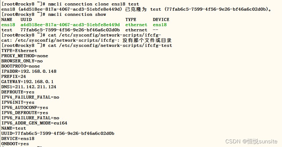 [root@rocky8 ~]# nmcli connection clone ens18 test ens18 (a4d518ee-817a-4067-acd3-51ebfe8e449d) 已克隆为 test (77fab6c5-7599-4f56-9e26-bf46a6c02d0b)。