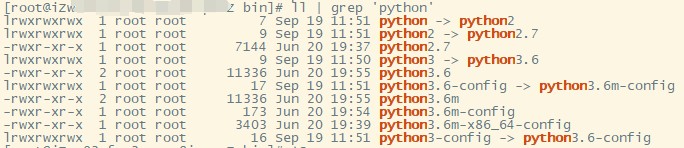 可以看到当前服务器已经安装了python2.7和python3.6两个版本(其中python2.7是yum程序必须的),这里我先演示将python3的软链接从python3.6修改为我最新安装的python3.10。