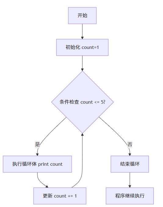 while count <= 5: # 步骤2:条件检查(当count<=5时继续)