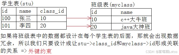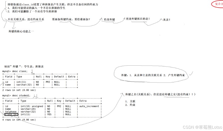 foreign key):关联两张表,保证数据逻辑一致性。