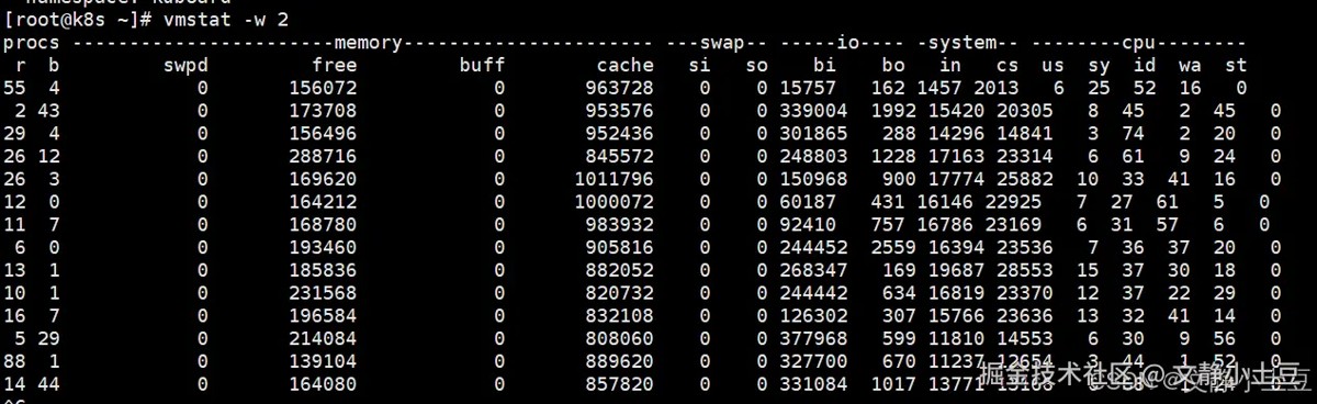 top # 按`1`显示多核cpu详情,观察us(用户态)、sy(内核态)、wa(i/o等待)等指标 vmstat 1 # 查看上下文切换(cs)、中断(in)等