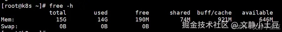 根据提供的 free -h 输出系统存在 内存耗尽风险(总内存 15g,已用 14g,可用仅 600mb),但未触发 swap(swap=0),以下是详细分析和解决方案: