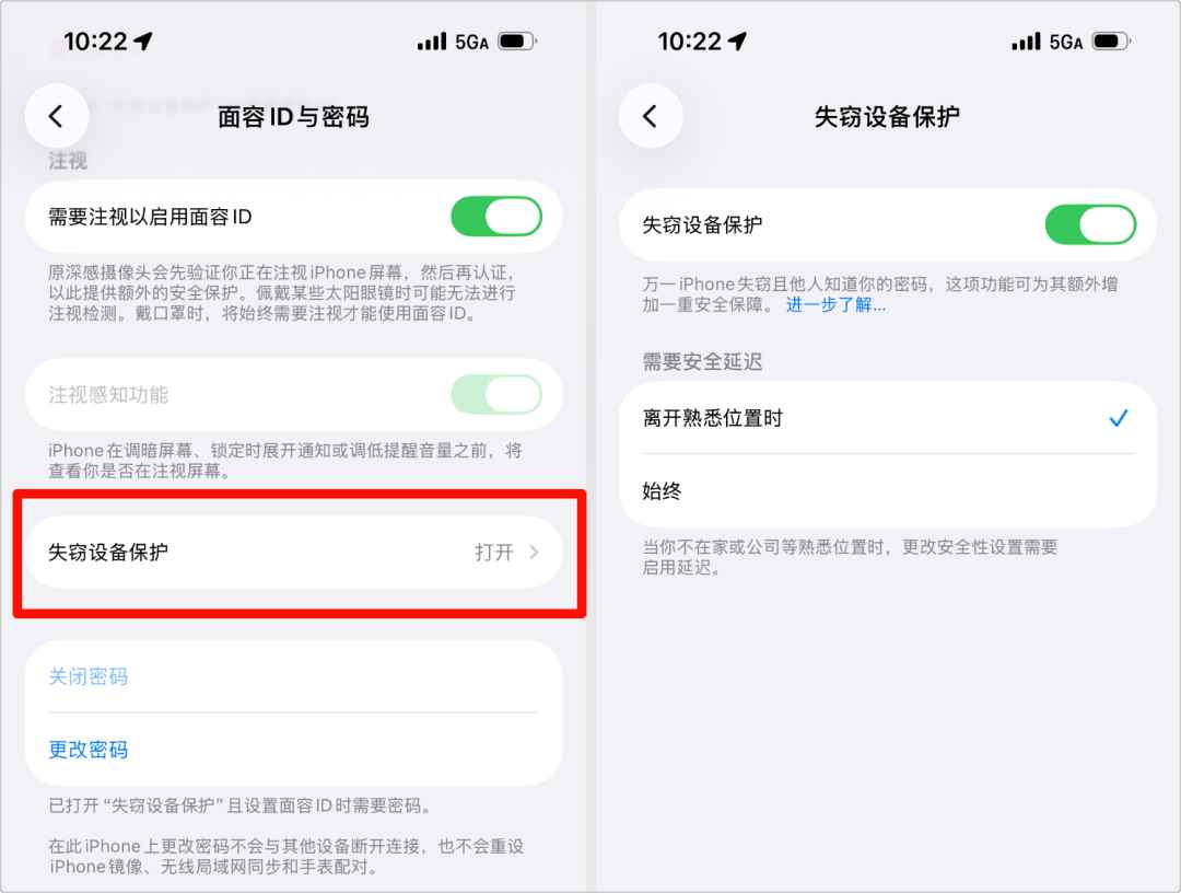 在设置-面容id-失窃设备保护中,可以看到该功能的
