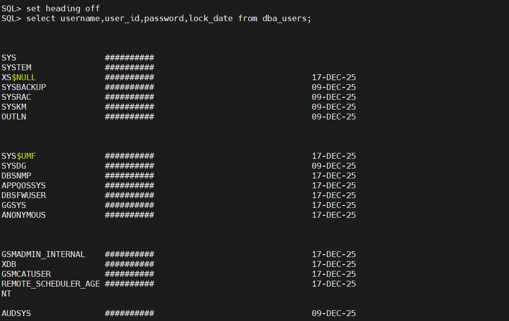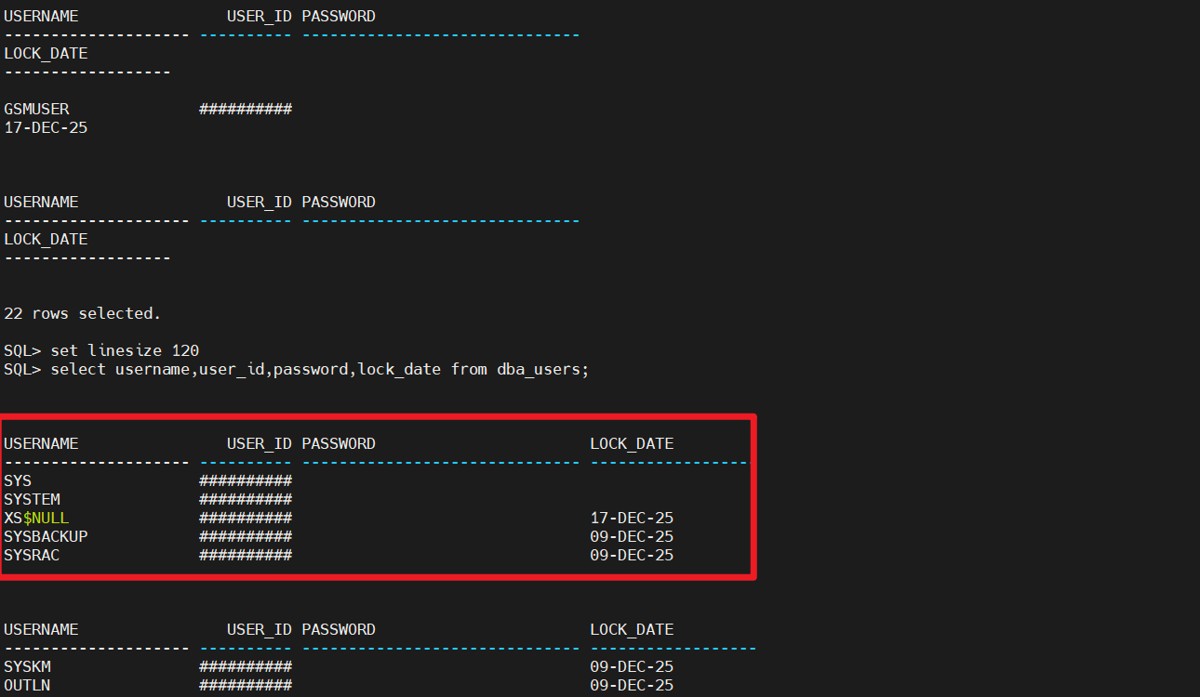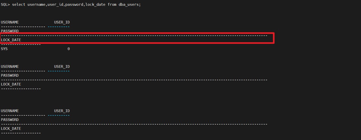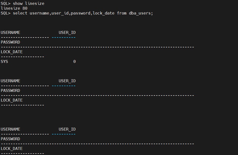 下面利用linesize的设置完成对查询结果的每行显示字符数的设置。从dba_users表中查询用户名(username)、密码(password)、用户id(user_id),并设置每行显示的字符数是120。
