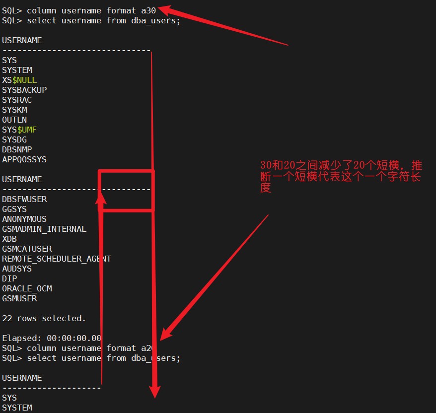 以上边问题中的查询结果为例,我们能看到数据库输出的每一个字段底下的虚线长度能一定程度反应出表在创建时预设的长度大小,但是在实际的生产过程中,我们往往使用不到这么长度字段,也不想显示这么长的字段,这时候,我们就需要通过对列进行字段长度控制。