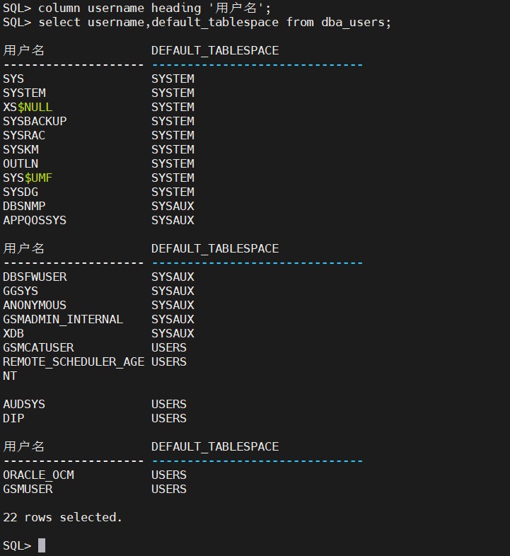 下面就使用上面的命令,查询dba_users 中的用户名(username)和用户id(user_id),并把username的列名使用column命令换成“用户名”。查询结果如下图所示: