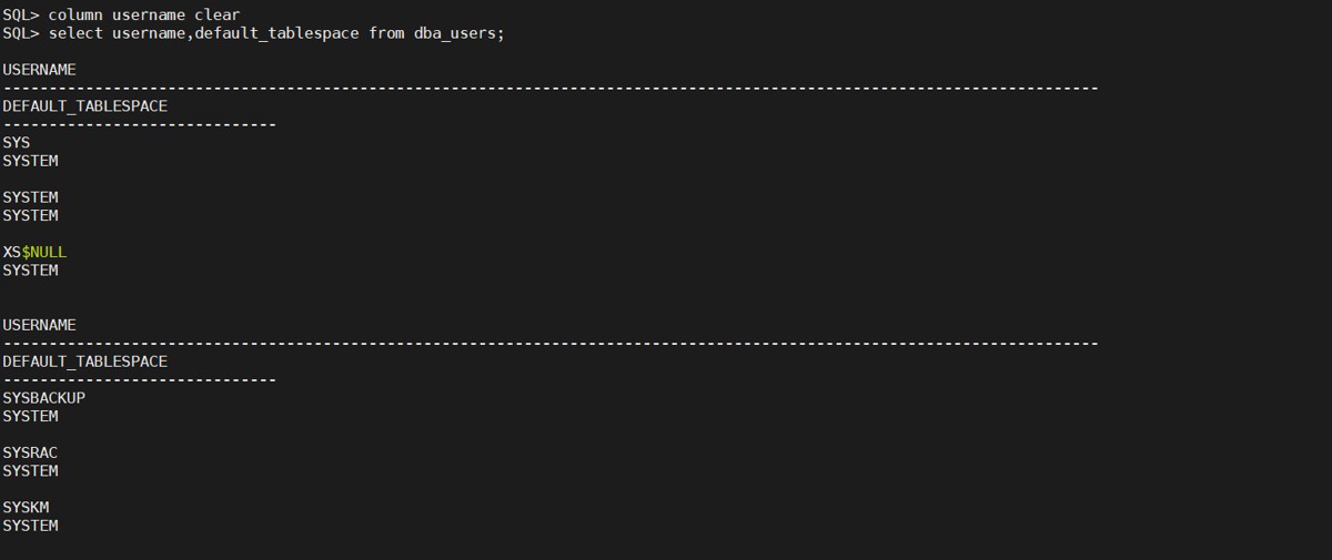 在oracle中,使用sql*plus工具来查询数据时经常会碰到的问题就是由于查询的列过多无法在一行全部显示出来,结果看起来非常混乱。例如,查询dba_users中的全部数据,这查询结果谁看谁脑壳大。