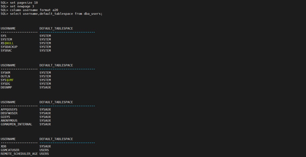 下面就利用上面的两个命令完成查询结果的设置。从dba_users表中查询用户名(username),设置每页显示10行,每页之间间隔3个空格。具体操作如下图所示: