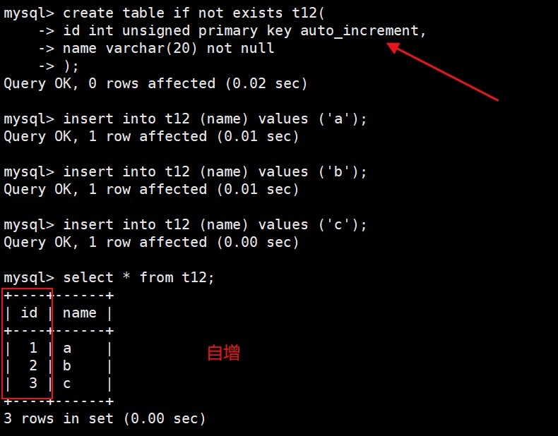auto_increment:当对应的字段,不给值,会自动的被系统触发,系统会从当前字段中已经有的最大值+1操作,得到一个新的不同的值。通常和主键搭配使用,作为逻辑主键。