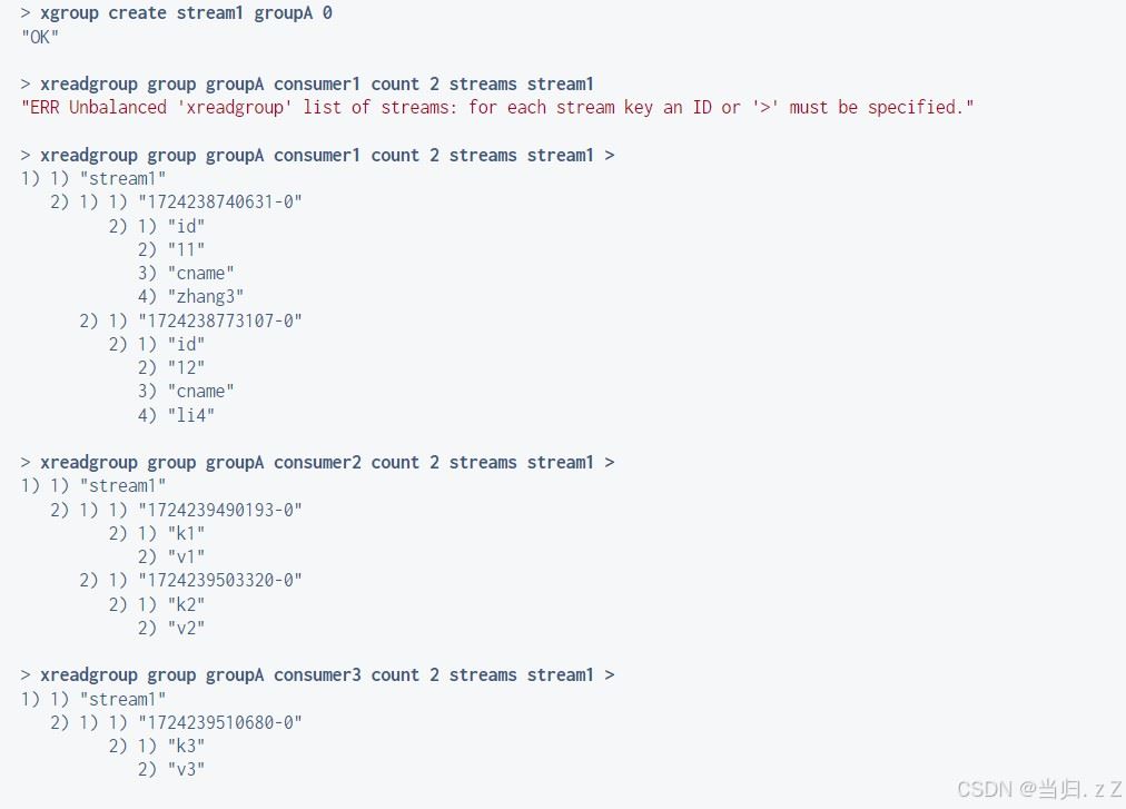 xgroup create 创建消费者组,$表示从尾部开始消费(即只消费新加入的消息),0表示从头部