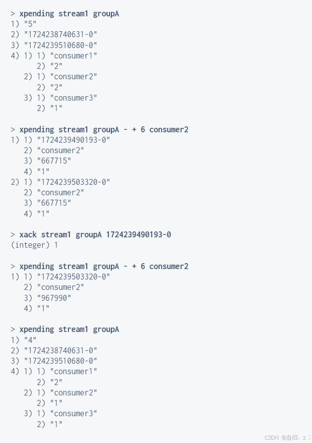 xpending 查询每个消费组内所有消费者【已读取,但尚未确认】的消息 xack 向消息队列确认消息处理已完成