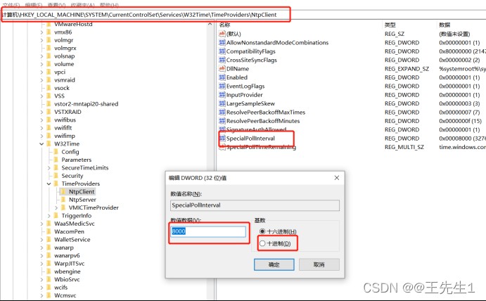 timeproviders\ntpclient],双击specialpollinterval键值,将对话框中的“基数栏”选择到“十进制”上,设置同步周期,以秒为单位