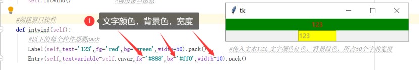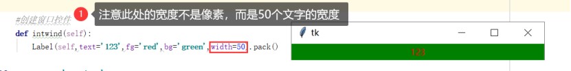 label(self,text='123',fg='red',bg='green',width=50).pack() #传入文本123,文字颜色红色,背景绿色,所占50个字的宽度