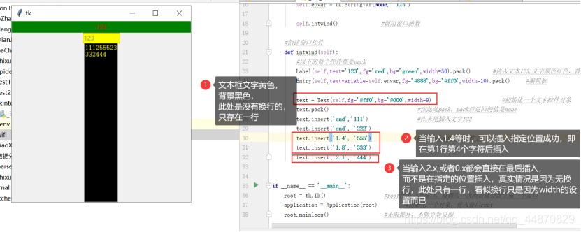text.insert('2.1', '444') #当输入2.x或者0.x时,都是插入最后面,原因可能是只有一行,无换行