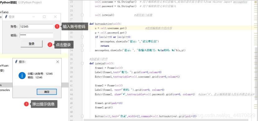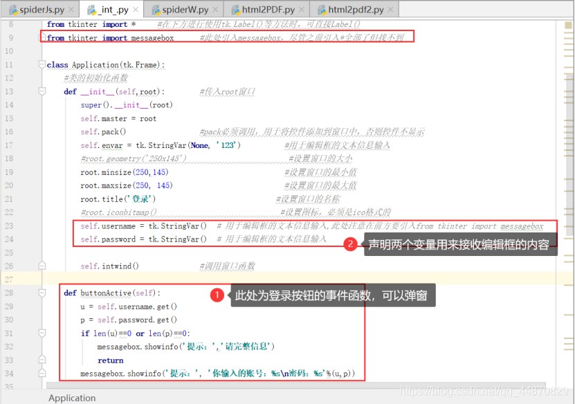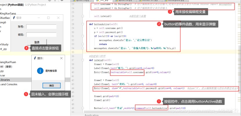 self.username = tk.stringvar() # 用于编辑框的文本信息输入,此处注意在前方要引入from tkinter import messagebox