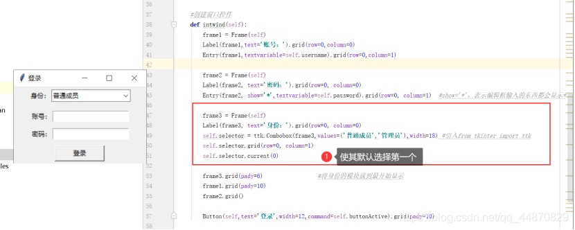 self.selector = ttk.combobox(frame3,values=('普通成员','管理员'),width=18) #引入from tkinter import ttk