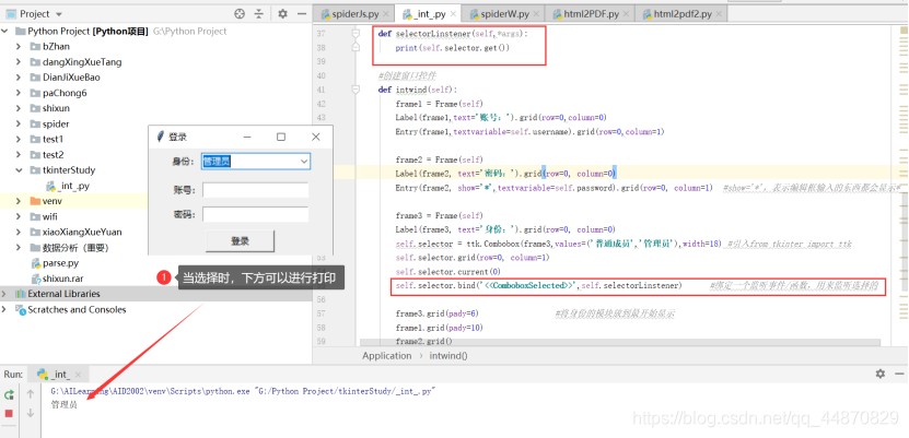 self.selector.bind('<<comboboxselected>>',self.selectorlinstener) #绑定一个监听事件/函数,用来监听选择的