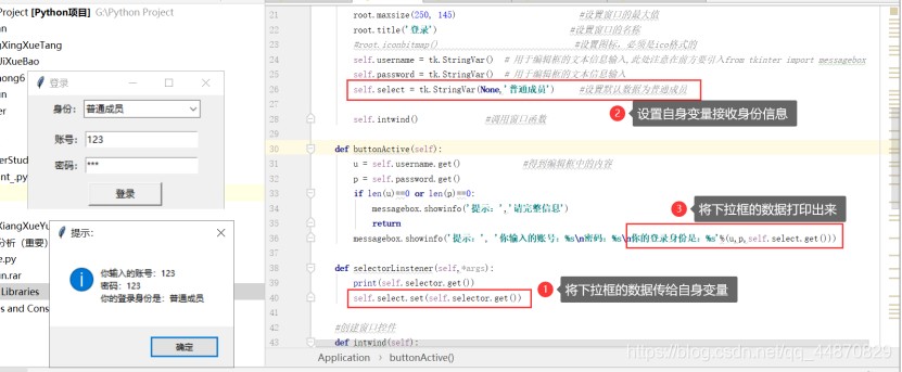 messagebox.showinfo('提示:', '你输入的账号:%s\n密码:%s\n你的登录身份是:%s'%(u,p,self.select.get()))