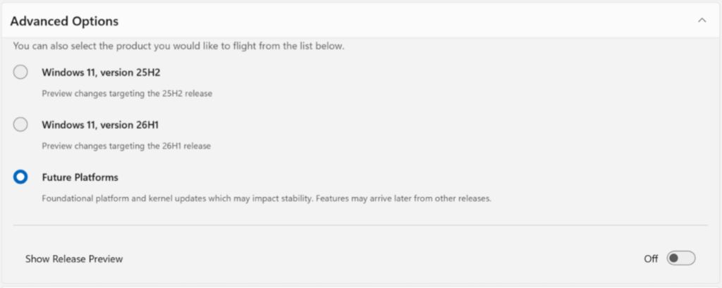 原 canary 频道用户将根据版本号分流至 experimental 频道下的未来平台或 26h1 版本。这些更新将在未来几周内开始向全体预览体验成员推送。