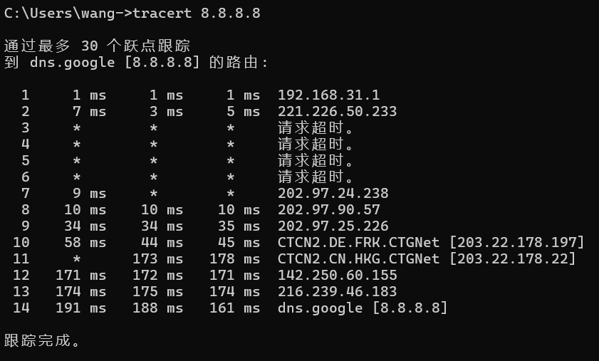 tracert 8.8.8.8或tracert -d www.baidu.com(-d不解析域名,加快)