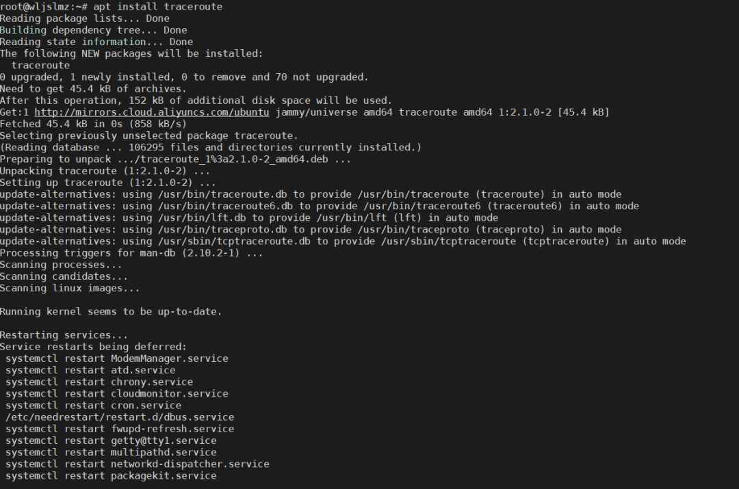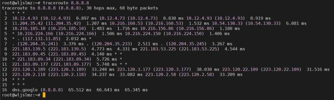 输出:每跳显示ip和延迟,* * * 表示超时。