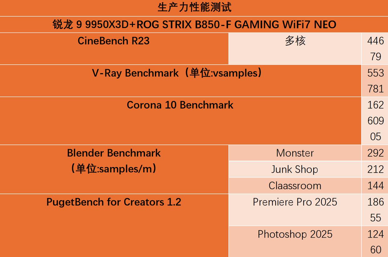 处理器生产力性能测试中,锐龙9 9950x3d处理器在cinebench r23中的跑分达到了44679分。而在考验多线程性能的3d渲染软件中,也获得了出色的成绩。rog strix b850-f gaming wifi7 neo凭借豪华的供电、散热配置,在考验处理器性能的生产力测试中,其表现达到了高端x870主板的水平。