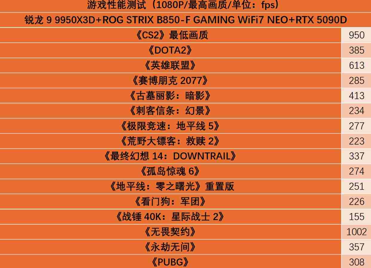 实际的游戏性能方面,rog strix b850-f gaming wifi7 neo加上锐龙9 9950x3d和rtx 5090 d的组合,在《无畏契约》这种电竞fps游戏中甚至可以达到千帧水平,电竞网游的游戏表现堪称顶级,而在3a游戏大作中的帧率也非常流畅。由此可见,使用rog strix b850-f gaming wifi7 neo搭配锐龙9 9950x3d组建顶级游戏主机,也是毫无问题的。