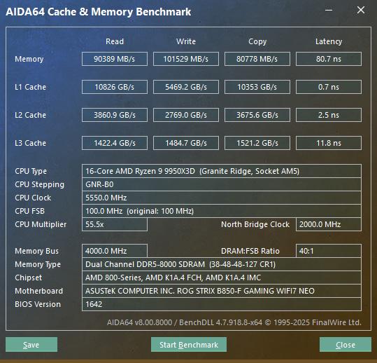 内存性能测试部分,我们将ddr5 6000内存换成了ddr5 8000内存。在bios中开启expo功能,内存就能自动将频率提升到8000mt/s。此时内存读取速度为90389mb/s,写入速度为101529mb/s,延迟80.7ns,这个读写性能表现对amd平台来说是非常优秀的,说明rog strix b850-f gaming wifi7 neo可以轻松满足高频内存对信号稳定性的需求,玩家也可以用来搭配低时序内存来提升电竞游戏的表现。