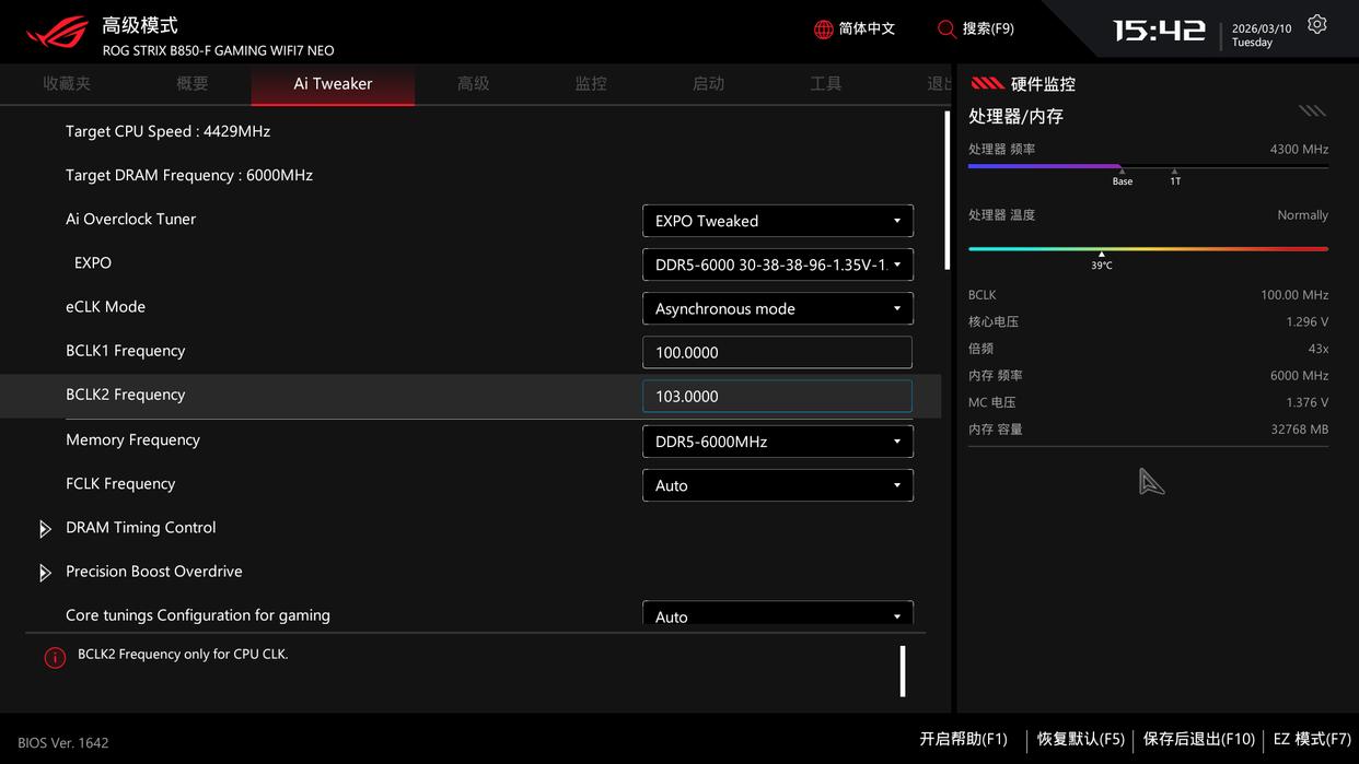 和之前的tuf gaming x870-pro neo一样,rog strix b850-f gaming wifi7 neo也内置了异步时钟发生器,支持外频超频。具体的超频方式是在ai overclock tuner开启manusl选项后,就能在eclk mode(外频模式)中解锁同步或者异步模式,选择asynchronous异步模式后多出的bclk 2选项,就可以单独对处理器的外频进行调节了。