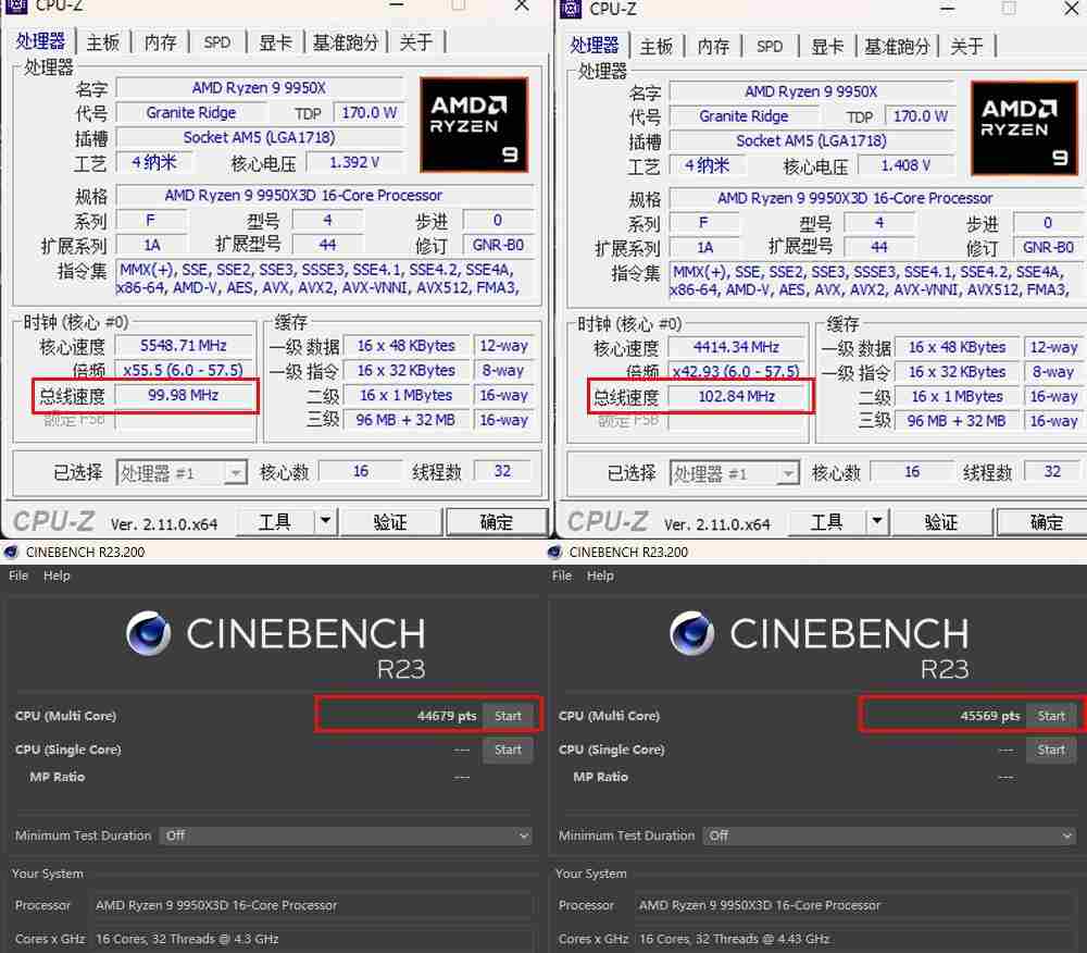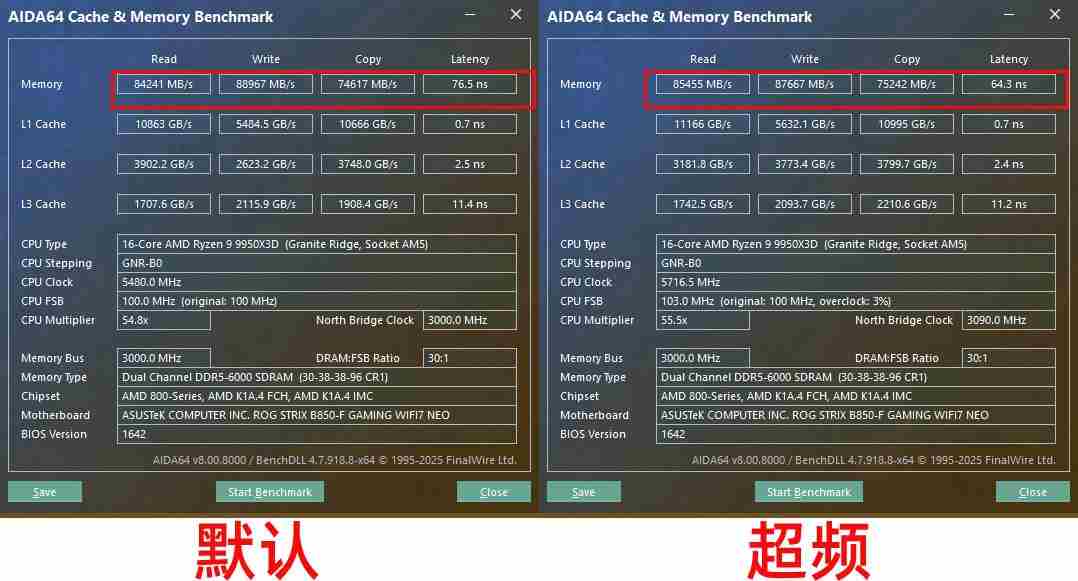 我们使用锐龙9 9950x3d进行测试,将外频增加了3mhz,cinebench r23多线程得分从44679提升到45569,提升幅度约2%,超频爱好者使用这块主板更能发挥平台的极限性能。除此之外,对处理器外频的调整,也会给内存、ssd的性能带来额外收益。可以看到,在仅调节外频频率的情况下,内存的读写性能和延迟表现都得到了进一步提升,如果内存的颗粒体质一般,可以通过超外频的方法来提升性能。