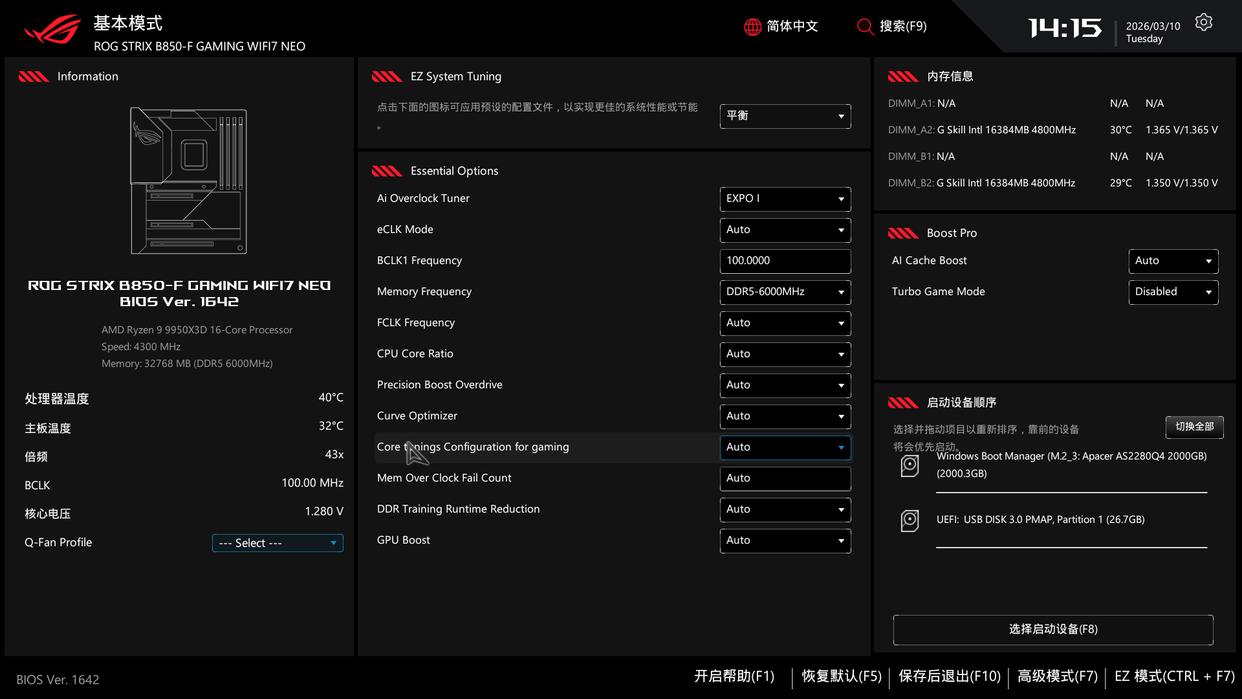 rog strix b850-f gaming wifi7 neo采用了最新的bios,新版bios的ui更有设计感和战斗感,支持1080p分辨率。新增的essential超频控制为pc diy新手提供简单易用的配置选项,高级模式下也为经验丰富的老手提供全面的调节功能。