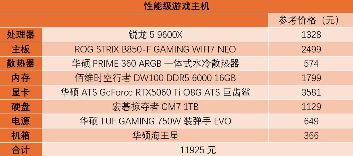 最后我们也给大家推荐一套基于rog strix b850-f gaming wifi7 neo主板的性能级rog信仰锐龙主机。主机选择了锐龙5 9600x处理器+rtx 5060 ti的核心硬件,从游戏性能上来看,这套配置配合rog strix b850-f gaming wifi7 neo主板和华硕机电散,在主流的3a游戏和电竞网游中都可以获得出色性能表现。另外考虑到目前内存的价格,这里推荐大家先上单条16gb内存,根据我们此前的实测,单条16gb内存和32gb套条间的游戏性能表现差距很小,综合差距不到5%,因此对于部分预算紧张的玩家来说单条16gb内存完全够用,省下的钱可以买一套不错的外设,等后面内存价格合适了再看自己的需求补上一条内存即可。