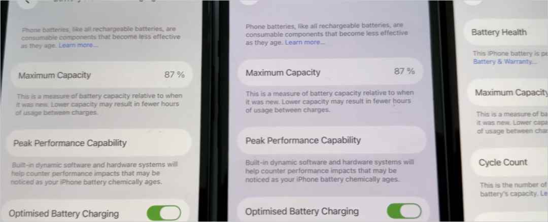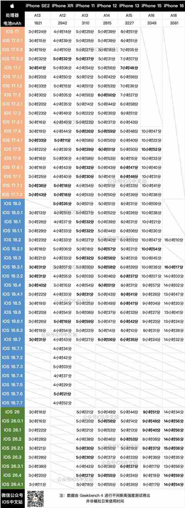 上方是ios17、 ios18所有版本、到目前 ios26 的续航实测时间,大家自行对比。注意:要考虑电池健康度逐渐下降的问题,所以对比相近的版本比较合理