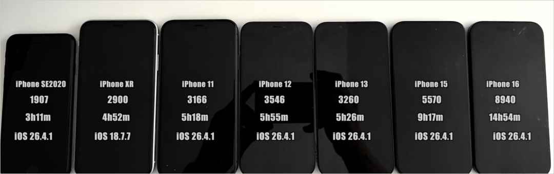 上周,苹果发布了 ios 26.4.1 正式版,主要是修复bug,没有带来新功能,那么续航怎样呢?外网博主 iapplebytes 带来了对比实测。本次测试一共使用 7 款 iphone,分别为 iphone se2 / xr / 11 / 12 / 13 / 15 / 16,包含了 a12 ~ a18 的芯片。