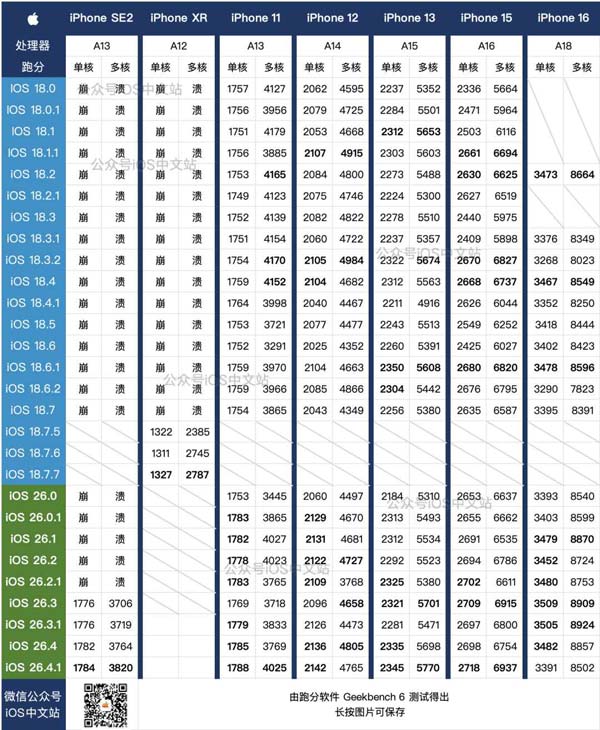 ios26.4.1正式版的跑分结果呈现一致性: