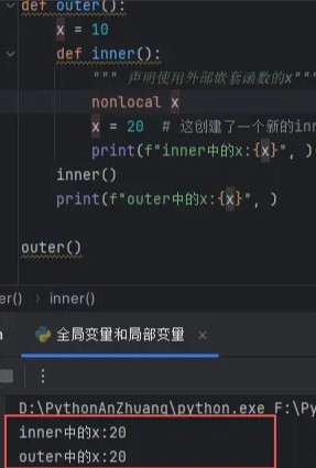 inner函数并没能修改outer函数的变量x。那怎么能把它改了呢?这时候就需要nonlocal:
