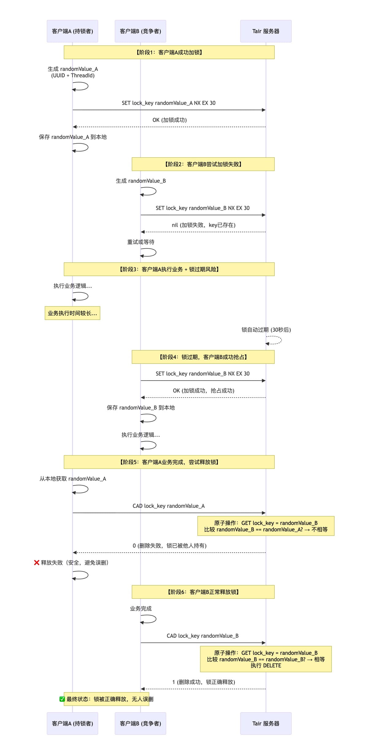 这是两者最直观的区别。在原生redis中,为了避免误删其他客户端的锁,解锁操作必须使用lua脚本,先get校验random_value再del。而tair提供了原生的cad(compare and delete)命令,将“比较并删除”合并为一个原子操作,无需编写脚本。