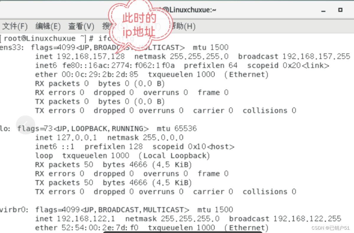 1、ip地址的查看在linux系统中在操作界面输入指令ifconfig或者ip addr就可以查看此时系统对应的ip地址可以看到此时的ip地址为192.168.157.1282、ip地址的修改我这里用