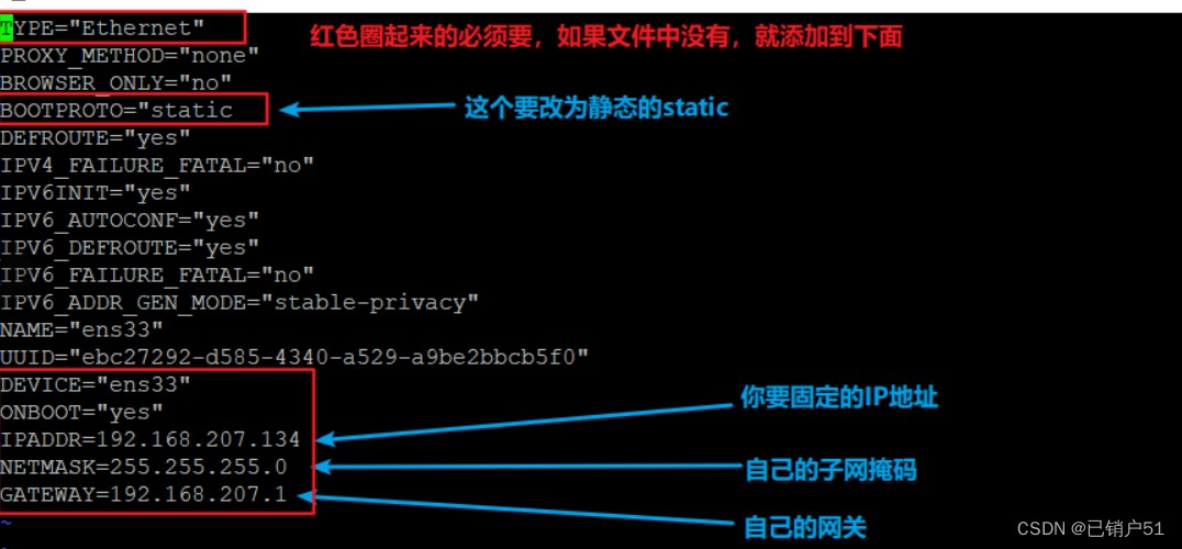 在终端输入命令 vi /etc/sysconfig/network-scripts/ifcfg-ens33进入下面的vi书写界面