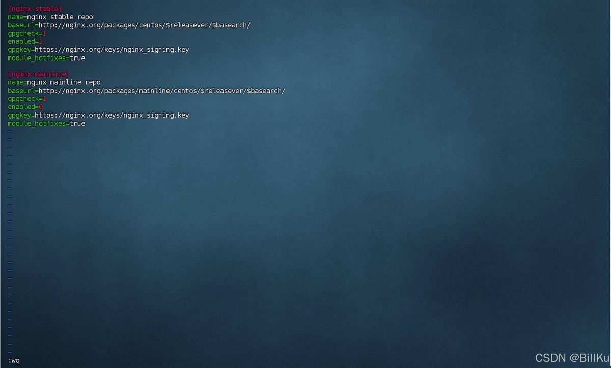 [nginx-stable] name=nginx stable repo baseurl=http://nginx.org/packages/centos/$releasever/$basearch/ gpgcheck=1 enabled=1 gpgkey=https://nginx.org/keys/nginx_signing.key module_hotfixes=true [nginx-mainline] name=nginx mainline repo baseurl=http://nginx.org/packages/mainline/centos/$releasever/$basearch/ gpgcheck=1 enabled=0 gpgkey=https://nginx.org/keys/nginx_signing.key module_hotfixes=true