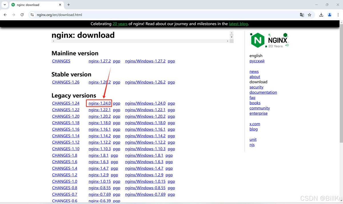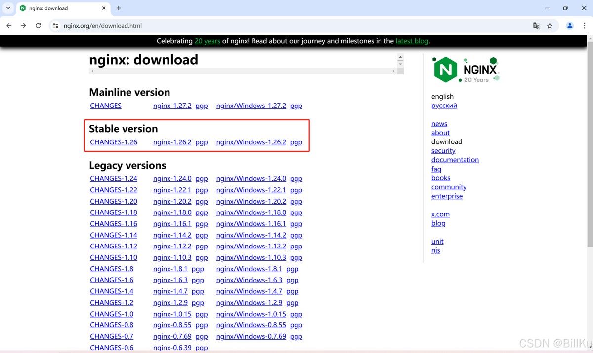 在远程终端计算机上,打开nginx官网:https://nginx.org/,下载文件