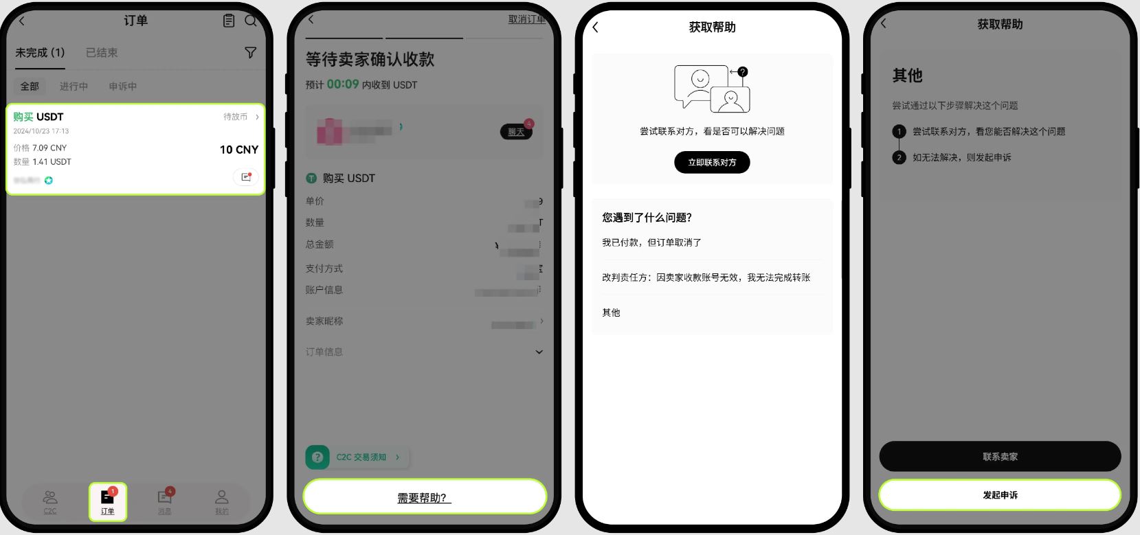 如果您是申诉方,点击【c2c买币】-【订单】,在【已结束】的订单中,找到有纠纷的订单,点击订单进入详情页,点击【需要帮助?】。
