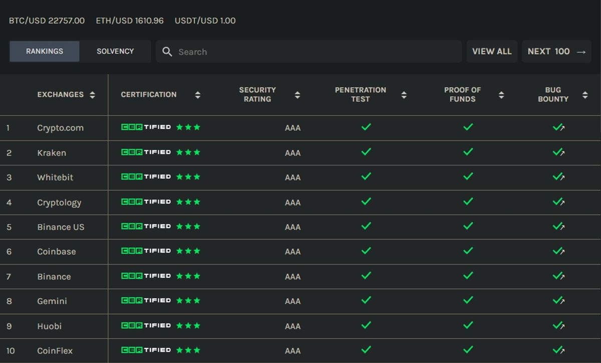 cer.live 除了看交易平台的安全以外也会把有没渗透测试、赏金计画、保证金等等纳入评级,从平台上都可以快速查询,下图是安全性前10 名的交易所。