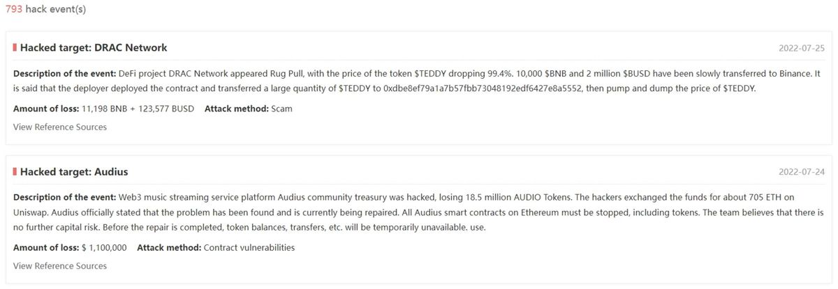 下图是文章撰写当下最近发生的两个资安事件,已图中发生的事件为例, 就不推荐在audius( https://audius.co/ ) 平台进行交易,因为攻击的类型属于合约漏洞,而且损失金额也不小。