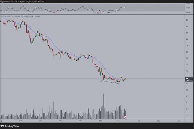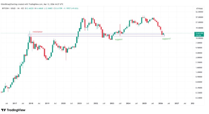 今年2月,该比率回落至12-13的关键支撑区域,此前该区域在2017年曾作为阻力,随后在2022年及2023年转为支撑。因此,目前的水平或将成为比特币对黄金长期趋势的潜在底部。