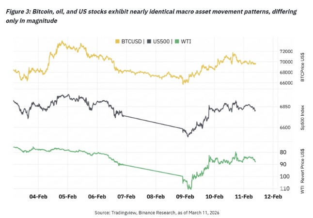 币安研究院指出,当前的宏观波动可能为比特币提供“风险中的机遇”。报告称,btc价格在美以与伊朗战争期间,与原油和美国股市等宏观资产走势趋同,反映全球事件正成为主导行情走向的关键因素。