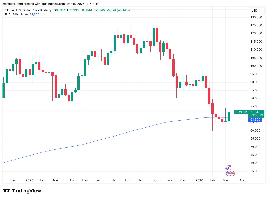 比特币逐步逼近一个重要的周收盘价,突破7万美元,这将包括收复重要的200周趋势线。